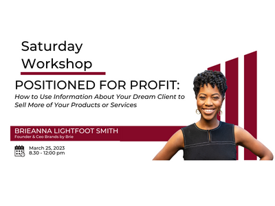 Online Event / Webinar Online, Dallas, TX 75247, DallasJoin us for our first Saturday workshop of 2023 with Brieanna Lightfoot Smith, Founder and CEO of Brands by Brie, for Positioned for Profit: How to Use Information About Your Dream Client to Sell More of Your Products or Services. The Positioned for Profit workshop will help participants get clarity on who they serve so […]